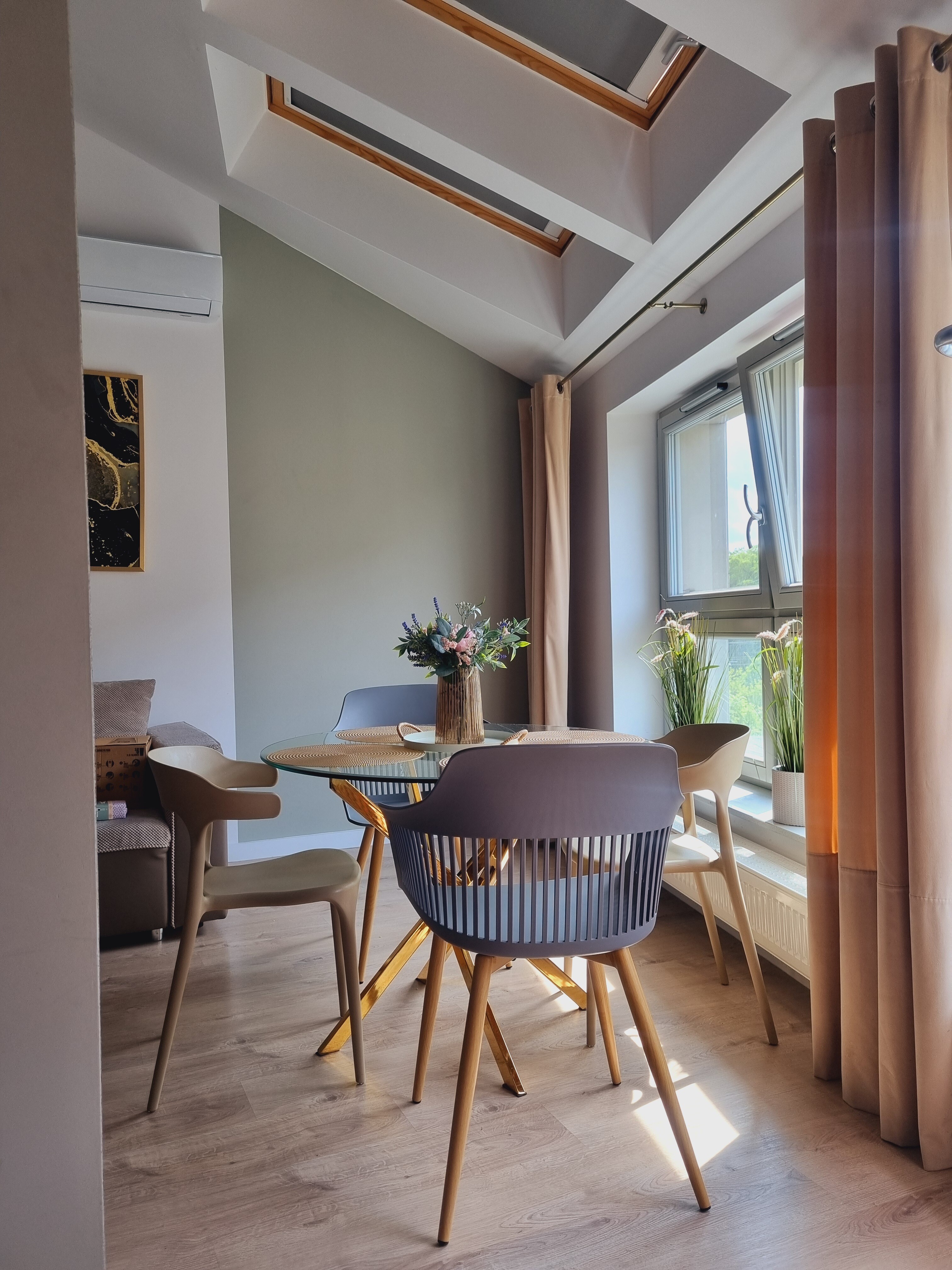 Mieszkanie jasne, przestronne przez wysokość sufitu i okien dachowych w których zamontowane zostały rolety dachowe sterowane pilotem.