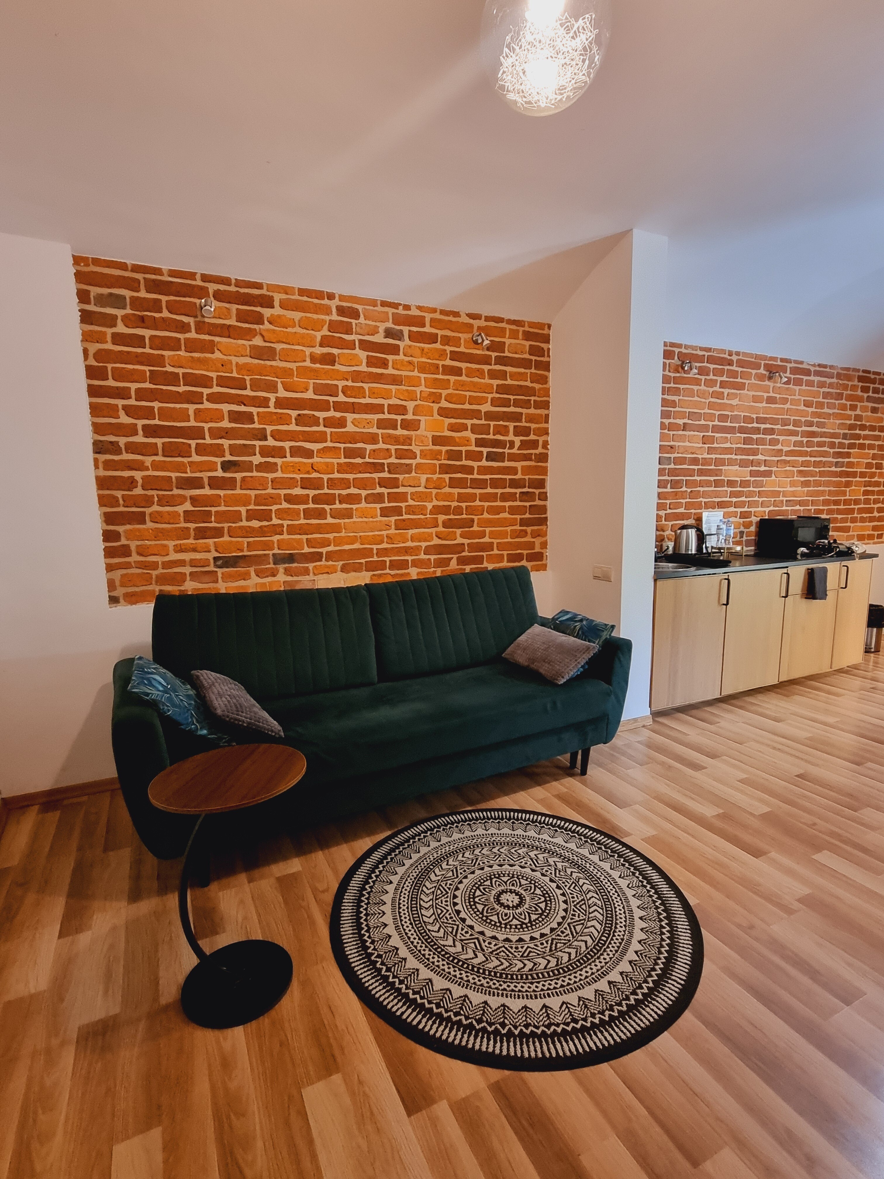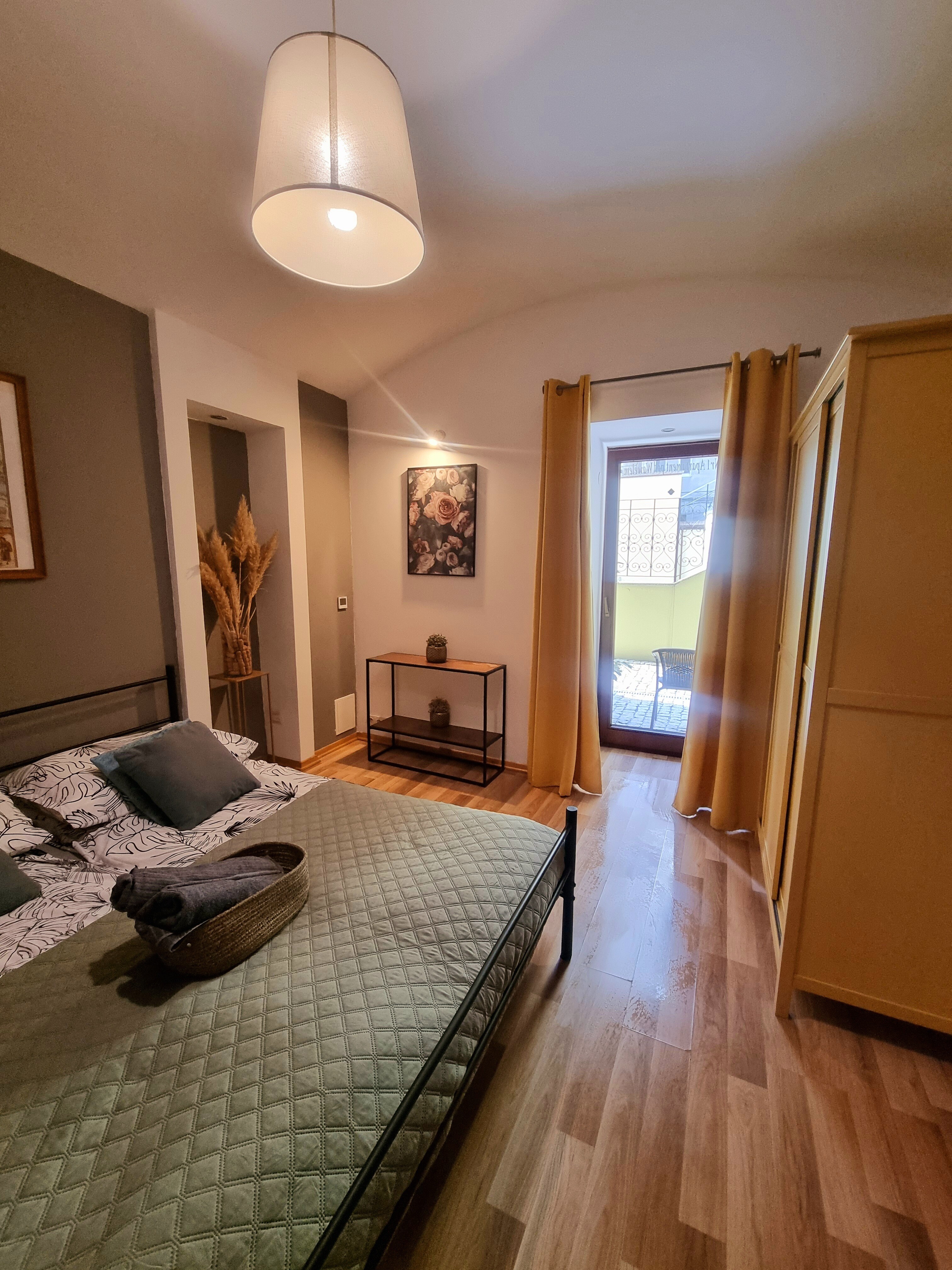 Apartament 52 metrowy z wyjściem na dziedziniec w skład, którego wchodzi: salon z dwuosobową sofą z funkcją spania, sypialnia z dwuosobowym łóżkiem, łazienka z prysznicem, w pełni wyposażony aneks kuchenny. Idealne maksymalnie dla 4 osób.
