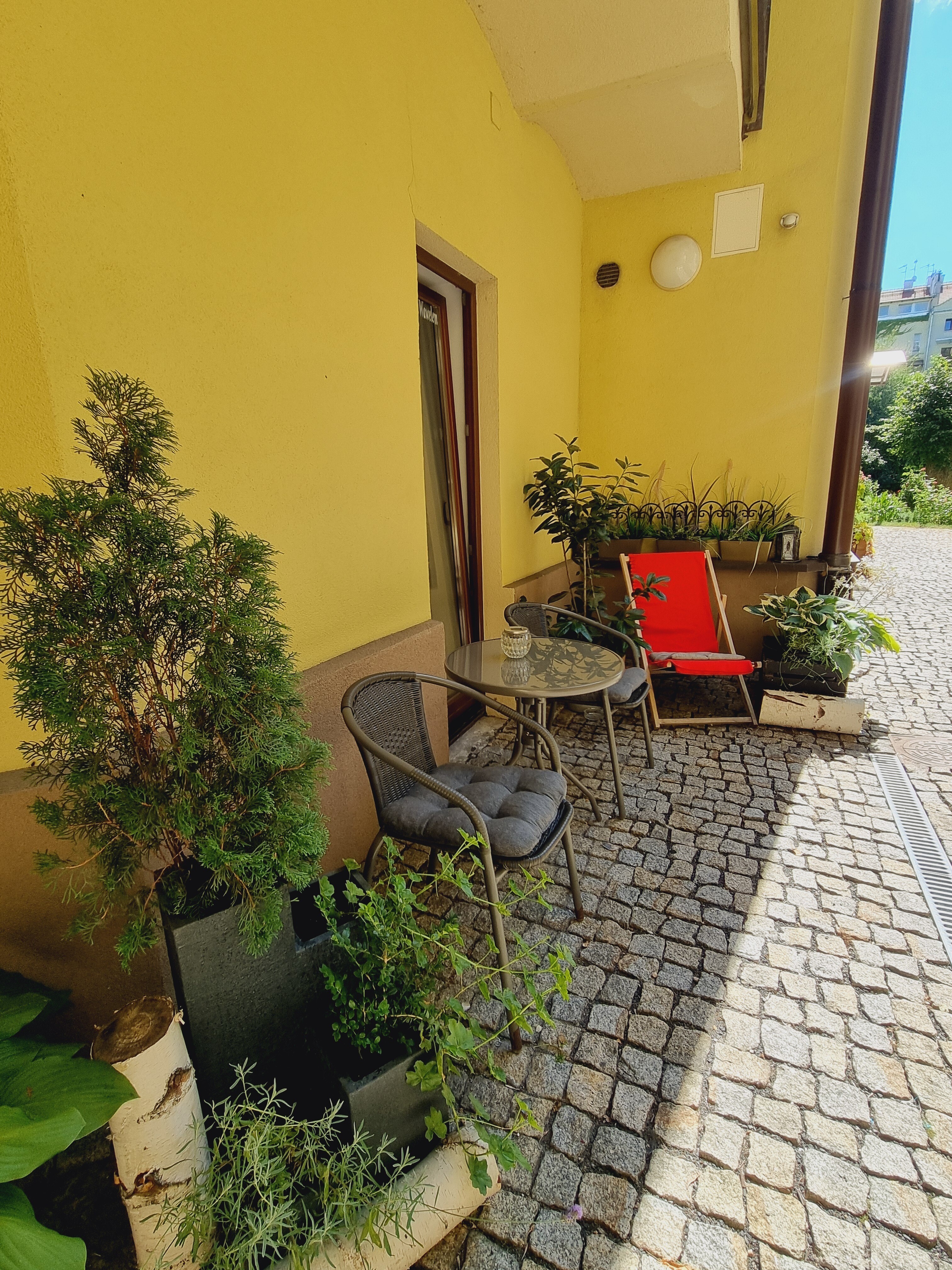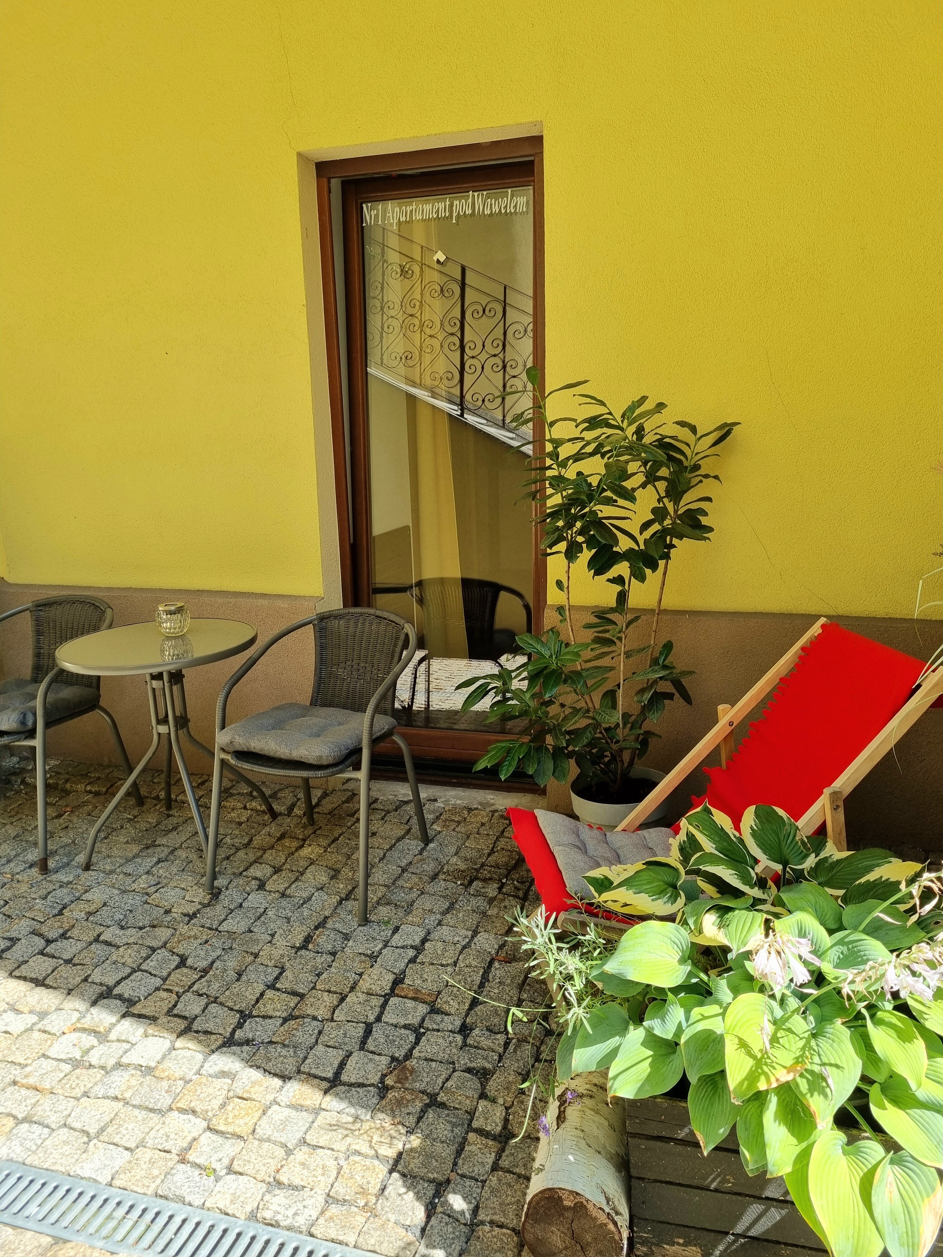 Goście tego apartamentu do swojej dyspozycji mają stolik z krzesłami na świeżym powietrzu z widokiem na wewnętrzny ogród kamienicy.