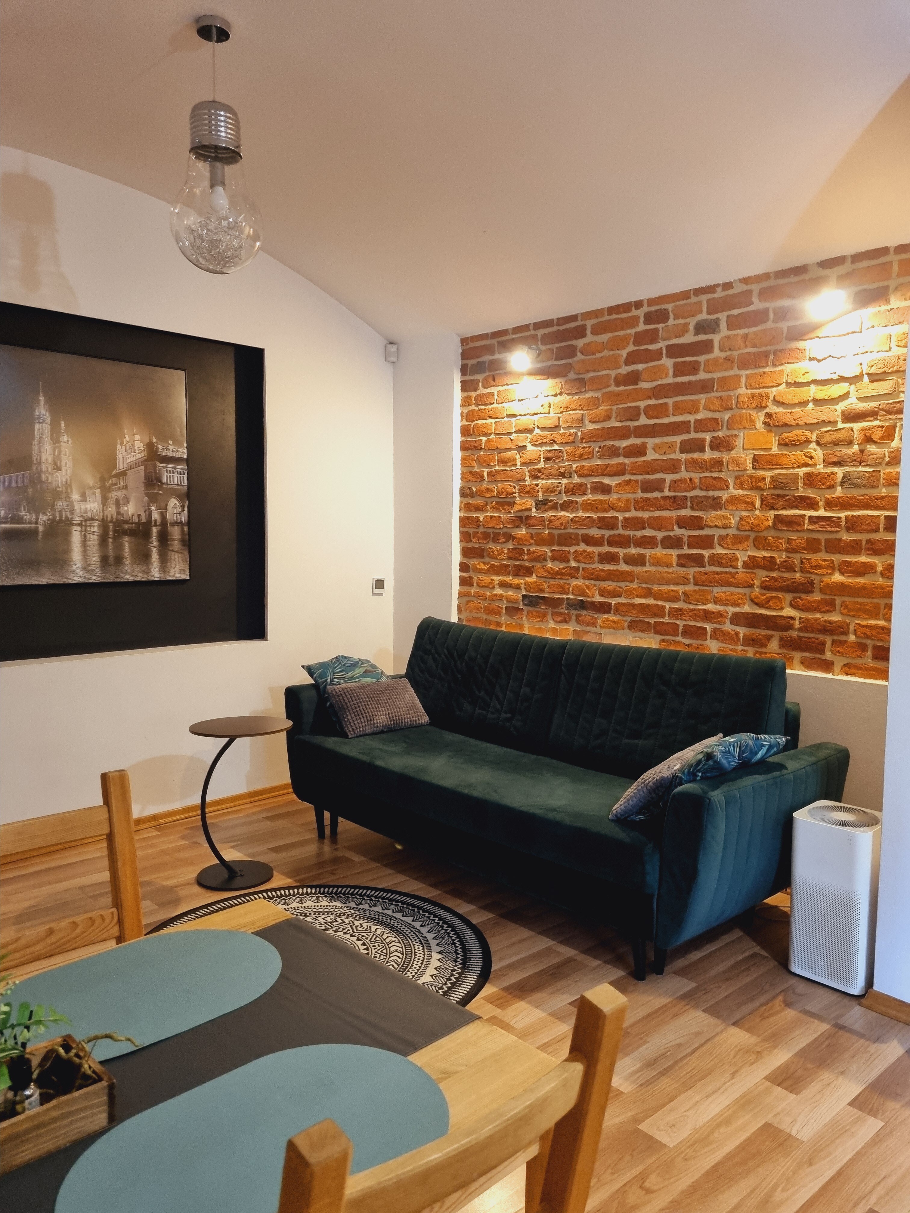 Mieszkanie urządzone w połączeniu krakowskiego stylu z odkrytymi cegłami i współczesnymi meblami/ dekoracjami.